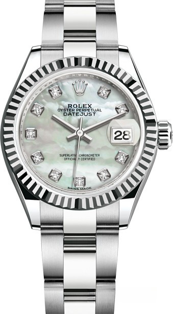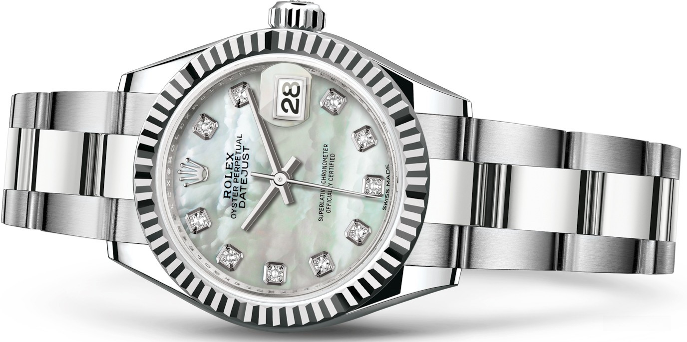 Часы Rolex Lady-Datejust изготовляются из белого золота 18к и нержавеющей стали с белым жемчужным циферблатом и 10-ю белыми бриллиантами. Модель Lady-Datejust оснащена калибром 2236 – механизмом нового поколения с функцией автоматического подзавода, который полностью разработан и изготовлен Ролексом. Данный механизм включает в себя кремниевую спираль Syloxi, запатентованную Ролексом, которая позволяет ему достигать хронометрической сверхточности, уникальной для женской модели часов. Этот механизм отмечен сертификатом Швейцарского хронометра, который выдан Официальным швейцарским институтом хронометрии (COSC). Часы комплектуются браслетом из нержавеющей стали.