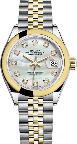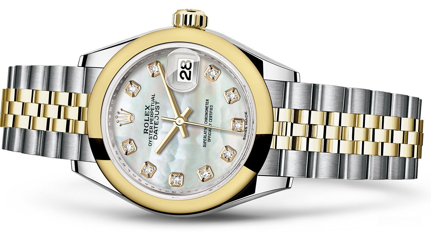 Часы Rolex Lady-Datejust изготовляются из нержавеющей стали и желтого золота 18к и отличаются новым циферблатом, который подчеркивает обновленный облик модели. Циферблат белый жемчужный с 10-ю белыми бриллиантами. Модель Lady-Datejust оснащена калибром 2236 – механизмом нового поколения с функцией автоматического подзавода, который полностью разработан и изготовлен Ролексом. Данный механизм включает в себя кремниевую спираль Syloxi, запатентованную Ролексом, которая позволяет ему достигать хронометрической сверхточности, уникальной для женской модели часов. Этот механизм отмечен сертификатом Швейцарского хронометра, который выдан Официальным швейцарским институтом хронометрии (COSC). Часы комплектуются браслетом из нержавеющей стали и желтого золота 18к.