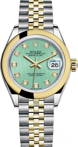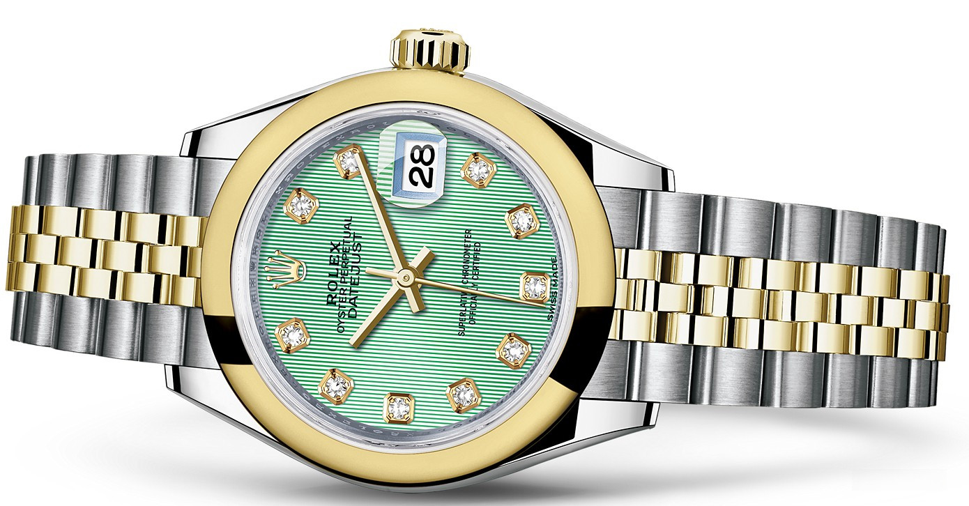 Часы Rolex Lady-Datejust изготовляются из нержавеющей стали и желтого золота 18к и отличаются новым циферблатом, который подчеркивает обновленный облик модели. Циферблат зеленый гильошированный, 10 белых бриллиантов. Модель Lady-Datejust оснащена калибром 2236 – механизмом нового поколения с функцией автоматического подзавода, который полностью разработан и изготовлен Ролексом. Данный механизм включает в себя кремниевую спираль Syloxi, запатентованную Ролексом, которая позволяет ему достигать хронометрической сверхточности, уникальной для женской модели часов. Этот механизм отмечен сертификатом Швейцарского хронометра, который выдан Официальным швейцарским институтом хронометрии (COSC). Часы комплектуются браслетом из нержавеющей стали и желтого золота 18к.