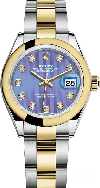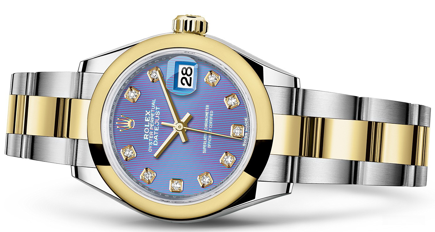 Часы Rolex Lady-Datejust изготовляются из нержавеющей стали и желтого золота 18к и отличаются новым циферблатом, который подчеркивает обновленный облик модели. Циферблат синий гильошированный, 10 белых бриллиантов. Модель Lady-Datejust оснащена калибром 2236 – механизмом нового поколения с функцией автоматического подзавода, который полностью разработан и изготовлен Ролексом. Данный механизм включает в себя кремниевую спираль Syloxi, запатентованную Ролексом, которая позволяет ему достигать хронометрической сверхточности, уникальной для женской модели часов. Этот механизм отмечен сертификатом Швейцарского хронометра, который выдан Официальным швейцарским институтом хронометрии (COSC). Часы комплектуются браслетом из нержавеющей стали и желтого золота 18к.