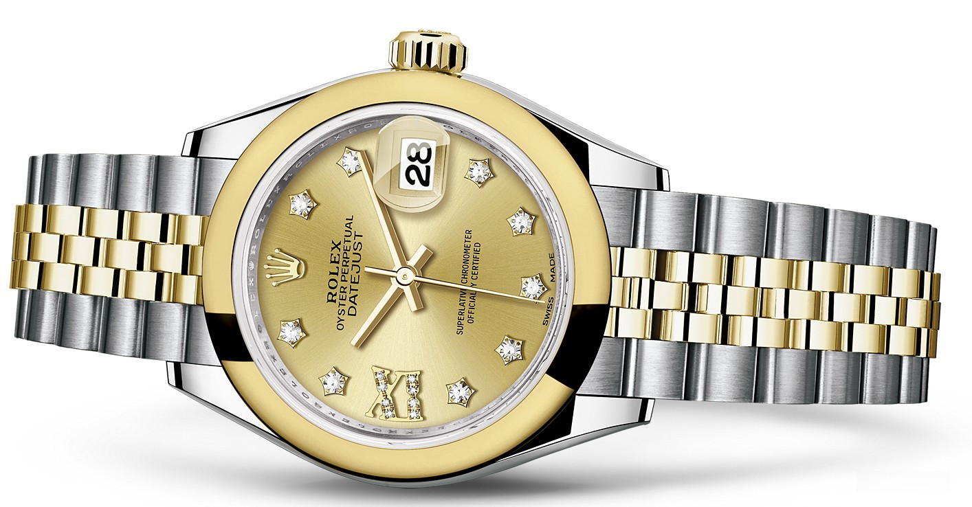 Часы Rolex Lady-Datejust изготовляются из нержавеющей стали и желтого золота 18к и отличаются новым циферблатом, который подчеркивает обновленный облик модели. Циферблат золотистый с белыми бриллиантами. Модель Lady-Datejust оснащена калибром 2236 – механизмом нового поколения с функцией автоматического подзавода, который полностью разработан и изготовлен Ролексом. Данный механизм включает в себя кремниевую спираль Syloxi, запатентованную Ролексом, которая позволяет ему достигать хронометрической сверхточности, уникальной для женской модели часов. Этот механизм отмечен сертификатом Швейцарского хронометра, который выдан Официальным швейцарским институтом хронометрии (COSC). Часы комплектуются браслетом из нержавеющей стали и желтого золота 18к.