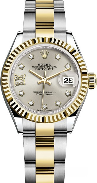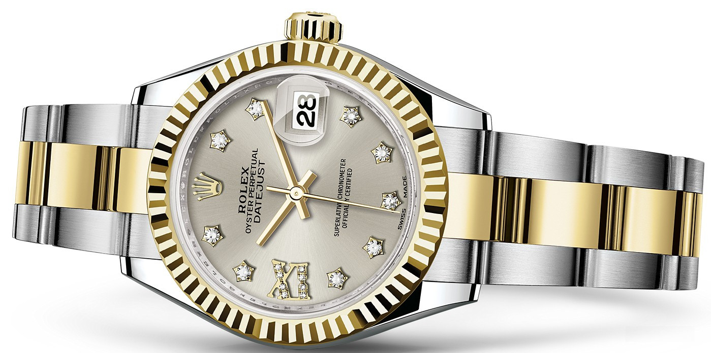 Часы Rolex Lady-Datejust изготовляются из нержавеющей стали и желтого золота 18к и отличаются новым циферблатом, который подчеркивает обновленный облик модели. Циферблат серебристый, белые бриллианты. Модель Lady-Datejust оснащена калибром 2236 – механизмом нового поколения с функцией автоматического подзавода, который полностью разработан и изготовлен Ролексом. Данный механизм включает в себя кремниевую спираль Syloxi, запатентованную Ролексом, которая позволяет ему достигать хронометрической сверхточности, уникальной для женской модели часов. Этот механизм отмечен сертификатом Швейцарского хронометра, который выдан Официальным швейцарским институтом хронометрии (COSC). Часы комплектуются браслетом из нержавеющей стали и желтого золота 18к.