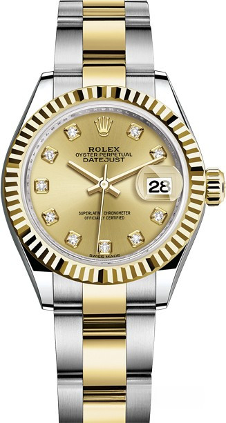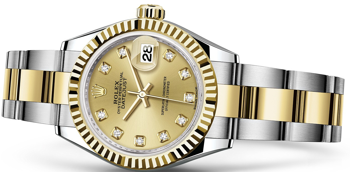 Часы Rolex Lady-Datejust изготовляются из нержавеющей стали и желтого золота 18к и отличаются новым циферблатом, который подчеркивает обновленный облик модели. Циферблат золотистый, 10 белых бриллиантов. Модель Lady-Datejust оснащена калибром 2236 – механизмом нового поколения с функцией автоматического подзавода, который полностью разработан и изготовлен Ролексом. Данный механизм включает в себя кремниевую спираль Syloxi, запатентованную Ролексом, которая позволяет ему достигать хронометрической сверхточности, уникальной для женской модели часов. Этот механизм отмечен сертификатом Швейцарского хронометра, который выдан Официальным швейцарским институтом хронометрии (COSC). Часы комплектуются браслетом из нержавеющей стали и желтого золота 18к.