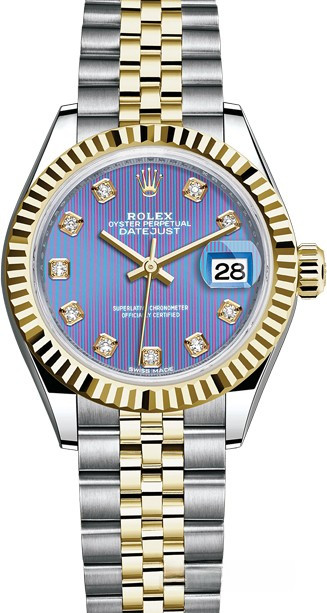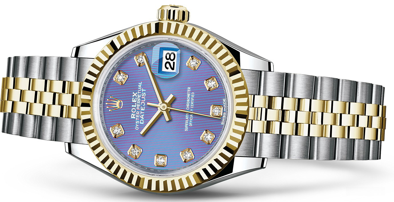 Часы Rolex Lady-Datejust изготовляются из нержавеющей стали и желтого золота 18к и отличаются новым циферблатом, который подчеркивает обновленный облик модели. Циферблат фиолетовый гильошированный, 10 белых бриллиантов. Модель Lady-Datejust оснащена калибром 2236 – механизмом нового поколения с функцией автоматического подзавода, который полностью разработан и изготовлен Ролексом. Данный механизм включает в себя кремниевую спираль Syloxi, запатентованную Ролексом, которая позволяет ему достигать хронометрической сверхточности, уникальной для женской модели часов. Этот механизм отмечен сертификатом Швейцарского хронометра, который выдан Официальным швейцарским институтом хронометрии (COSC). Часы комплектуются браслетом из нержавеющей стали и желтого золота 18к.