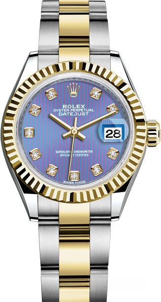 Часы Rolex Lady-Datejust изготовляются из нержавеющей стали и желтого золота 18к и отличаются новым циферблатом, который подчеркивает обновленный облик модели. Циферблат синий гильошированный, 10 белых бриллиантов. Модель Lady-Datejust оснащена калибром 2236 – механизмом нового поколения с функцией автоматического подзавода, который полностью разработан и изготовлен Ролексом. Данный механизм включает в себя кремниевую спираль Syloxi, запатентованную Ролексом, которая позволяет ему достигать хронометрической сверхточности, уникальной для женской модели часов. Этот механизм отмечен сертификатом Швейцарского хронометра, который выдан Официальным швейцарским институтом хронометрии (COSC). Часы комплектуются браслетом из нержавеющей стали и желтого золота 18к.