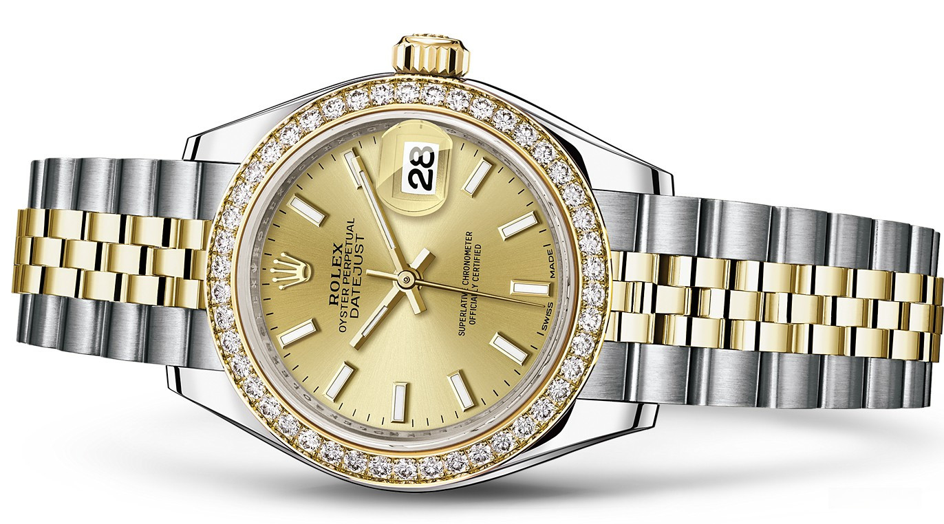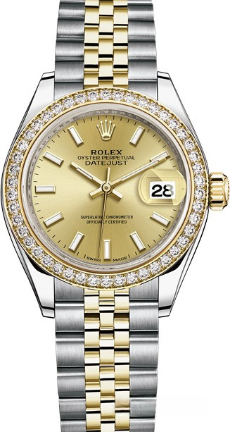 Часы Rolex Lady-Datejust изготовляются из нержавеющей стали и желтого золота 18к и отличаются новым циферблатом, который подчеркивает обновленный облик модели. Циферблат золотистый. Безель из белых бриллиантов. Модель Lady-Datejust оснащена калибром 2236 – механизмом нового поколения с функцией автоматического подзавода, который полностью разработан и изготовлен Ролексом. Данный механизм включает в себя кремниевую спираль Syloxi, запатентованную Ролексом, которая позволяет ему достигать хронометрической сверхточности, уникальной для женской модели часов. Этот механизм отмечен сертификатом Швейцарского хронометра, который выдан Официальным швейцарским институтом хронометрии (COSC). Часы комплектуются браслетом из нержавеющей стали и желтого золота 18к.