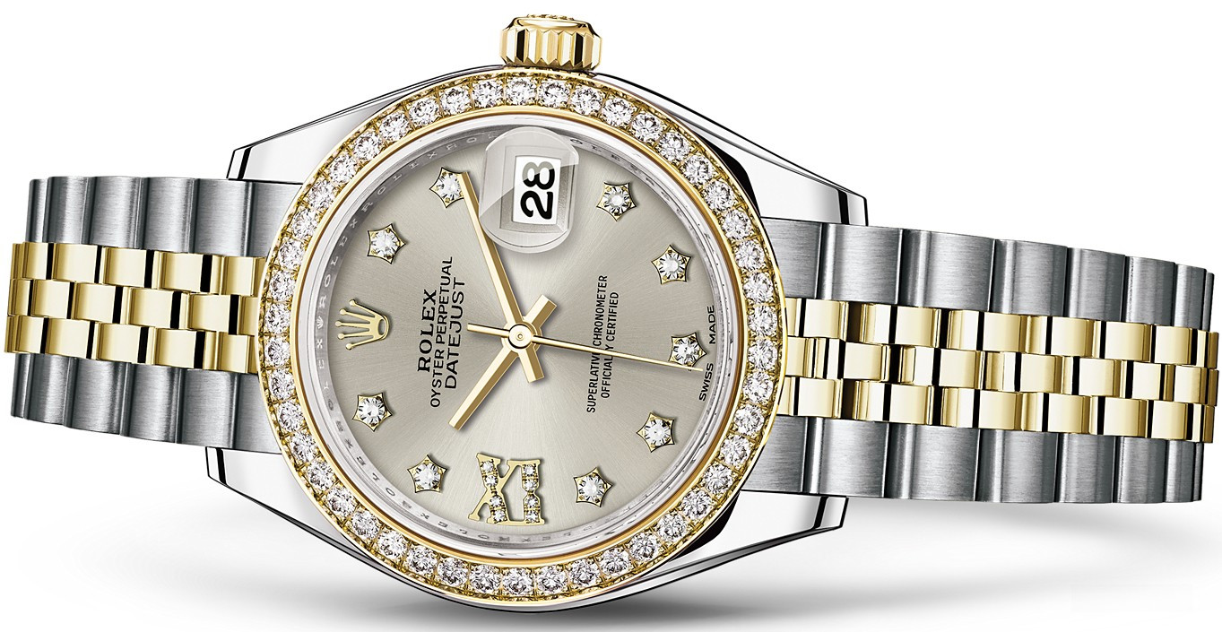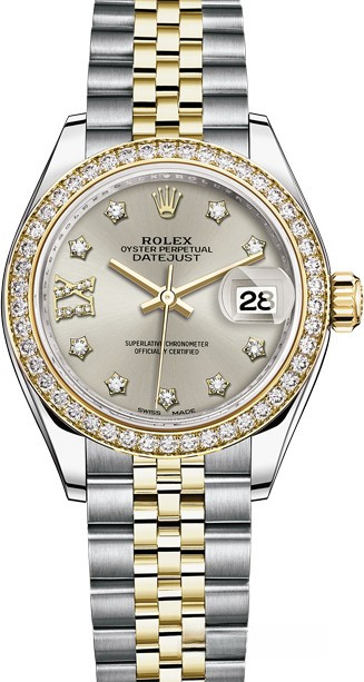 Часы Rolex Lady-Datejust изготовляются из нержавеющей стали и желтого золота 18к и отличаются новым циферблатом, который подчеркивает обновленный облик модели. Циферблат серебристый с белыми бриллиантами. Безель из белых бриллиантов. Модель Lady-Datejust оснащена калибром 2236 – механизмом нового поколения с функцией автоматического подзавода, который полностью разработан и изготовлен Ролексом. Данный механизм включает в себя кремниевую спираль Syloxi, запатентованную Ролексом, которая позволяет ему достигать хронометрической сверхточности, уникальной для женской модели часов. Этот механизм отмечен сертификатом Швейцарского хронометра, который выдан Официальным швейцарским институтом хронометрии (COSC). Часы комплектуются браслетом из нержавеющей стали и желтого золота 18к.