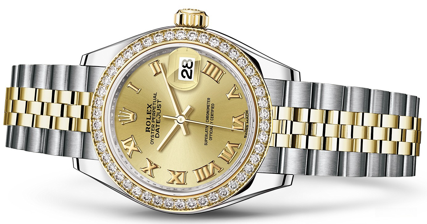 Часы Rolex Lady-Datejust изготовляются из нержавеющей стали и желтого золота 18к и отличаются новым циферблатом, который подчеркивает обновленный облик модели. Циферблат золотистый, безель из белых бриллиантов. Модель Lady-Datejust оснащена калибром 2236 – механизмом нового поколения с функцией автоматического подзавода, который полностью разработан и изготовлен Ролексом. Данный механизм включает в себя кремниевую спираль Syloxi, запатентованную Ролексом, которая позволяет ему достигать хронометрической сверхточности, уникальной для женской модели часов. Этот механизм отмечен сертификатом Швейцарского хронометра, который выдан Официальным швейцарским институтом хронометрии (COSC). Часы комплектуются браслетом из нержавеющей стали и желтого золота 18к.