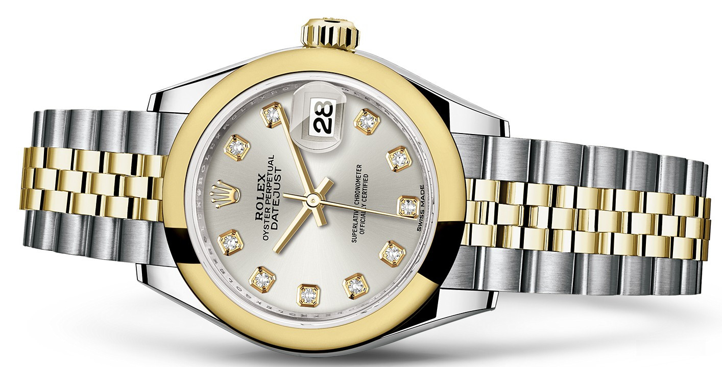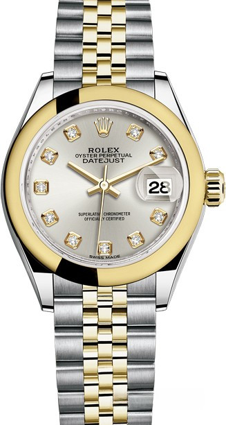 Часы Rolex Lady-Datejust изготовляются из нержавеющей стали и желтого золота 18к и отличаются новым циферблатом, который подчеркивает обновленный облик модели. Циферблат серебристый с 10-ю белыми бриллиантами. Модель Lady-Datejust оснащена калибром 2236 – механизмом нового поколения с функцией автоматического подзавода, который полностью разработан и изготовлен Ролексом. Данный механизм включает в себя кремниевую спираль Syloxi, запатентованную Ролексом, которая позволяет ему достигать хронометрической сверхточности, уникальной для женской модели часов. Этот механизм отмечен сертификатом Швейцарского хронометра, который выдан Официальным швейцарским институтом хронометрии (COSC). Часы комплектуются браслетом из нержавеющей стали и желтого золота 18к.