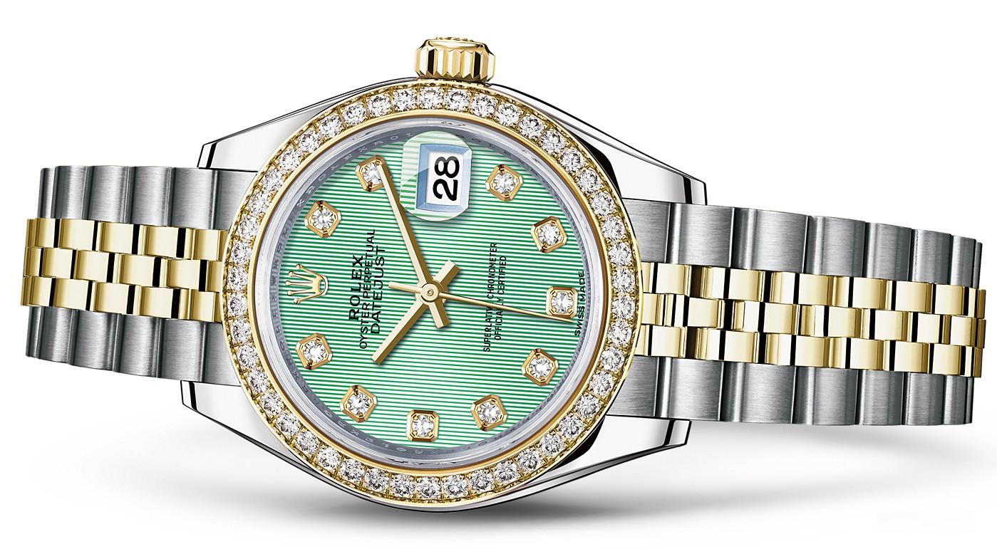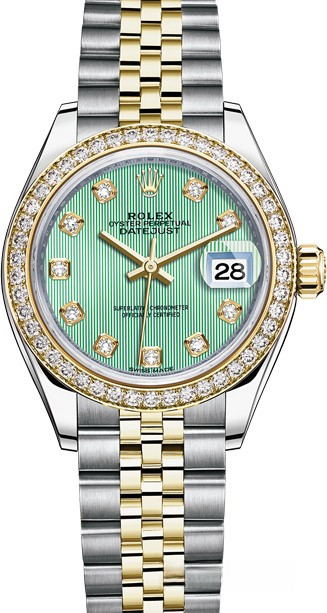 Часы Rolex Lady-Datejust изготовляются из нержавеющей стали и желтого золота 18к и отличаются новым циферблатом, который подчеркивает обновленный облик модели. Циферблат зеленый гильошированный с 10-ю белыми бриллиантами. Безель из белых бриллиантов. Модель Lady-Datejust оснащена калибром 2236 – механизмом нового поколения с функцией автоматического подзавода, который полностью разработан и изготовлен Ролексом. Данный механизм включает в себя кремниевую спираль Syloxi, запатентованную Ролексом, которая позволяет ему достигать хронометрической сверхточности, уникальной для женской модели часов. Этот механизм отмечен сертификатом Швейцарского хронометра, который выдан Официальным швейцарским институтом хронометрии (COSC). Часы комплектуются браслетом из нержавеющей стали и желтого золота 18к.
