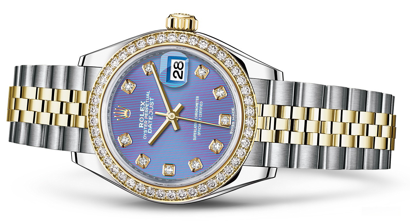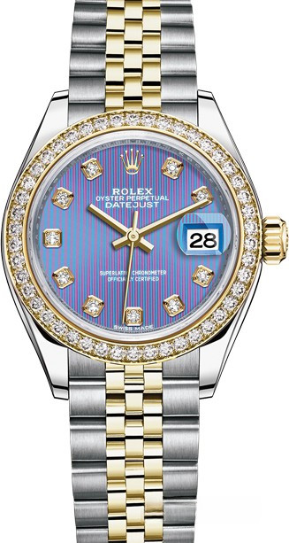 Часы Rolex Lady-Datejust изготовляются из нержавеющей стали и желтого золота 18к и отличаются новым циферблатом, который подчеркивает обновленный облик модели. Циферблат фиолетовый гильошированный с 10-ю белыми бриллиантами. Безель из белых бриллиантов. Модель Lady-Datejust оснащена калибром 2236 – механизмом нового поколения с функцией автоматического подзавода, который полностью разработан и изготовлен Ролексом. Данный механизм включает в себя кремниевую спираль Syloxi, запатентованную Ролексом, которая позволяет ему достигать хронометрической сверхточности, уникальной для женской модели часов. Этот механизм отмечен сертификатом Швейцарского хронометра, который выдан Официальным швейцарским институтом хронометрии (COSC). Часы комплектуются браслетом из нержавеющей стали и желтого золота 18к.