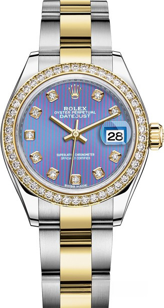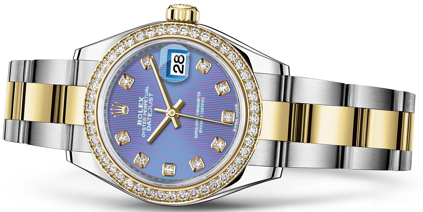 Часы Rolex Lady-Datejust изготовляются из нержавеющей стали и желтого золота 18к и отличаются новым циферблатом, который подчеркивает обновленный облик модели. Циферблат фиолетовый гильошированный, 10 белых бриллиантов. Безель из белых бриллиантов. Модель Lady-Datejust оснащена калибром 2236 – механизмом нового поколения с функцией автоматического подзавода, который полностью разработан и изготовлен Ролексом. Данный механизм включает в себя кремниевую спираль Syloxi, запатентованную Ролексом, которая позволяет ему достигать хронометрической сверхточности, уникальной для женской модели часов. Этот механизм отмечен сертификатом Швейцарского хронометра, который выдан Официальным швейцарским институтом хронометрии (COSC). Часы комплектуются браслетом из нержавеющей стали и желтого золота 18к.