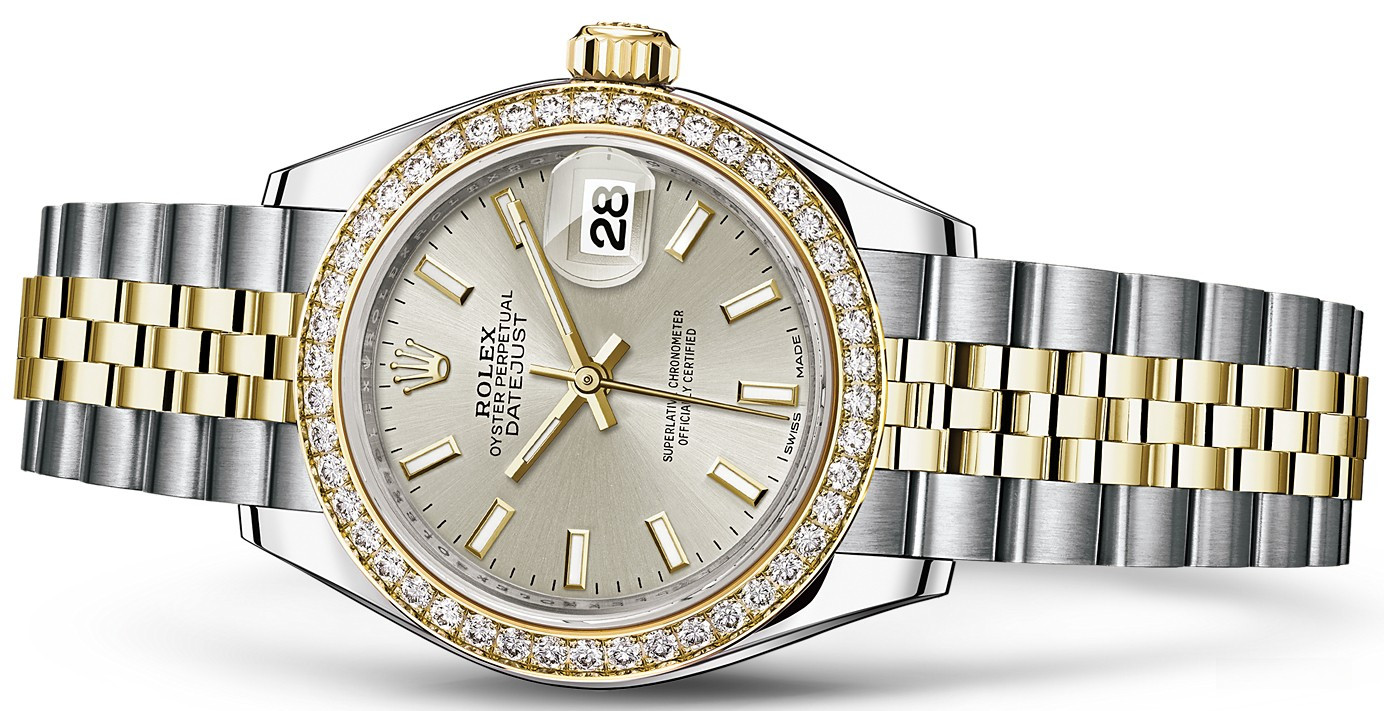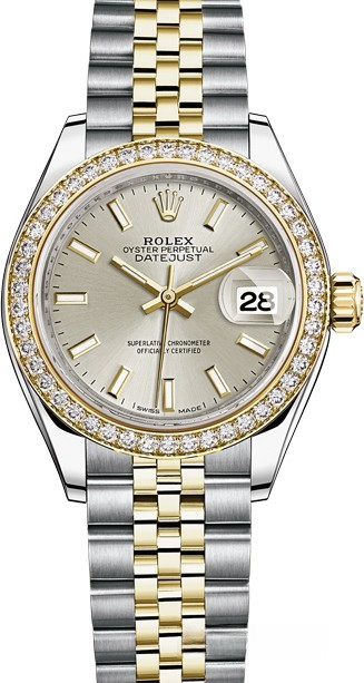 Часы Rolex Lady-Datejust изготовляются из нержавеющей стали и желтого золота 18к и отличаются новым циферблатом, который подчеркивает обновленный облик модели. Циферблат серебристый, безель из белых бриллиантов. Модель Lady-Datejust оснащена калибром 2236 – механизмом нового поколения с функцией автоматического подзавода, который полностью разработан и изготовлен Ролексом. Данный механизм включает в себя кремниевую спираль Syloxi, запатентованную Ролексом, которая позволяет ему достигать хронометрической сверхточности, уникальной для женской модели часов. Этот механизм отмечен сертификатом Швейцарского хронометра, который выдан Официальным швейцарским институтом хронометрии (COSC). Часы комплектуются браслетом из нержавеющей стали и желтого золота 18к.
