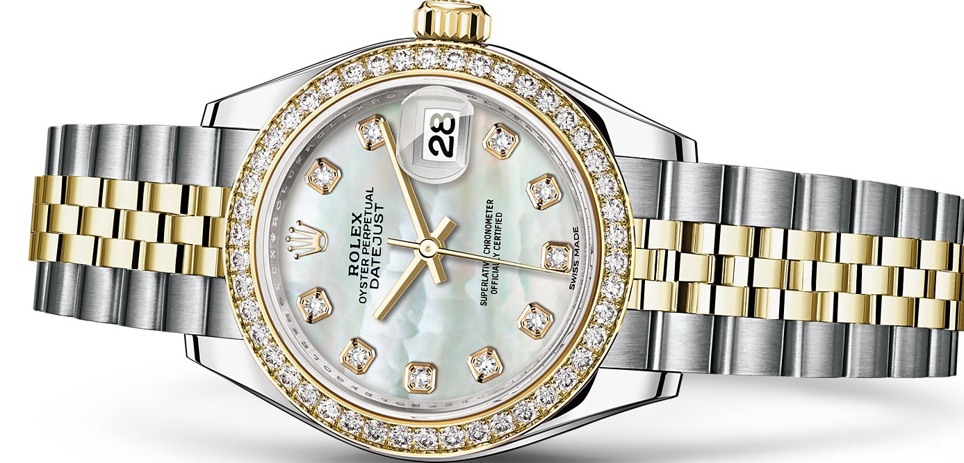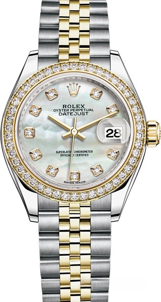 Часы Rolex Lady-Datejust изготовляются из нержавеющей стали и желтого золота 18к и отличаются новым циферблатом, который подчеркивает обновленный облик модели. Циферблат белый жемчужный с 10-ю белыми бриллиантами. Безель из белых бриллиантов. Модель Lady-Datejust оснащена калибром 2236 – механизмом нового поколения с функцией автоматического подзавода, который полностью разработан и изготовлен Ролексом. Данный механизм включает в себя кремниевую спираль Syloxi, запатентованную Ролексом, которая позволяет ему достигать хронометрической сверхточности, уникальной для женской модели часов. Этот механизм отмечен сертификатом Швейцарского хронометра, который выдан Официальным швейцарским институтом хронометрии (COSC). Часы комплектуются браслетом из нержавеющей стали и желтого золота 18к.