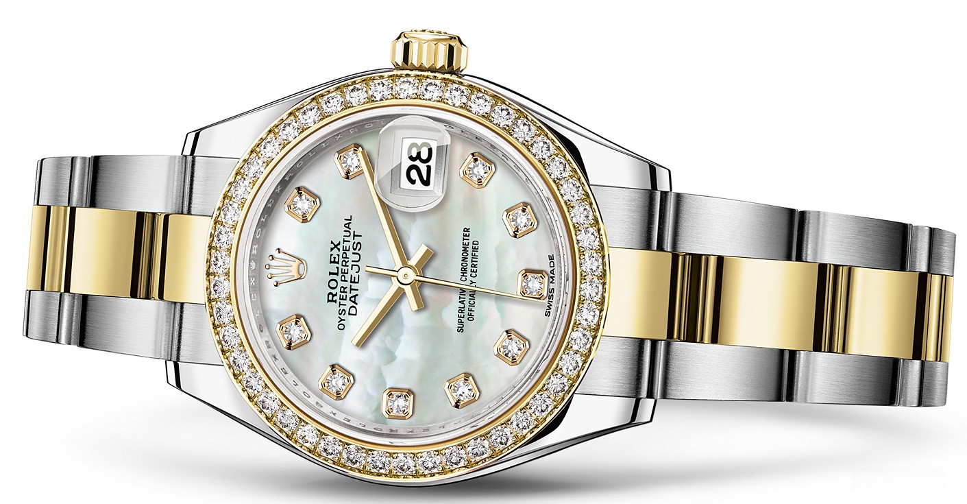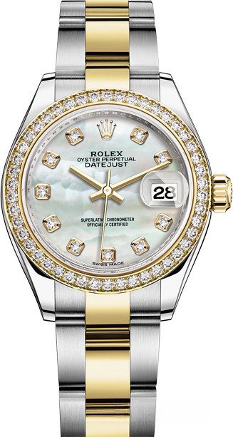 Часы Rolex Lady-Datejust изготовляются из нержавеющей стали и желтого золота 18к и отличаются новым циферблатом, который подчеркивает обновленный облик модели. Циферблат белый жемчужный, 10 белых бриллиантов, безель из белых бриллиантов. Модель Lady-Datejust оснащена калибром 2236 – механизмом нового поколения с функцией автоматического подзавода, который полностью разработан и изготовлен Ролексом. Данный механизм включает в себя кремниевую спираль Syloxi, запатентованную Ролексом, которая позволяет ему достигать хронометрической сверхточности, уникальной для женской модели часов. Этот механизм отмечен сертификатом Швейцарского хронометра, который выдан Официальным швейцарским институтом хронометрии (COSC). Часы комплектуются браслетом из нержавеющей стали и желтого золота 18к.