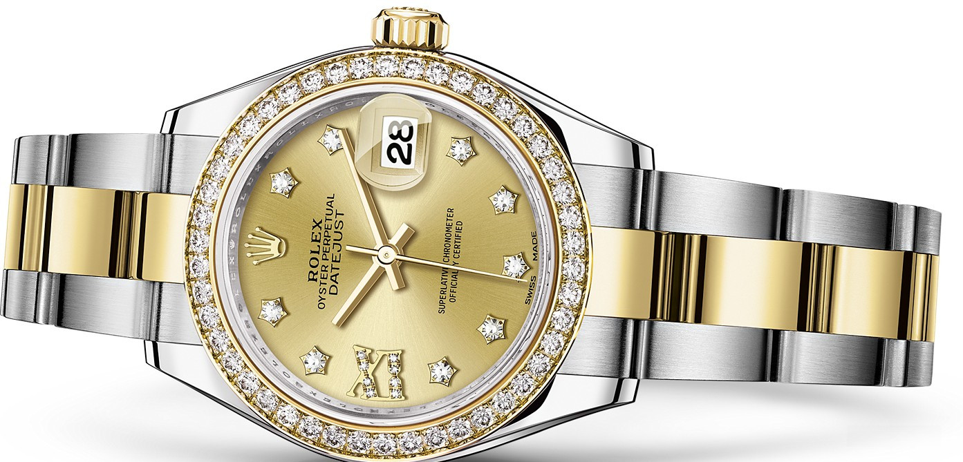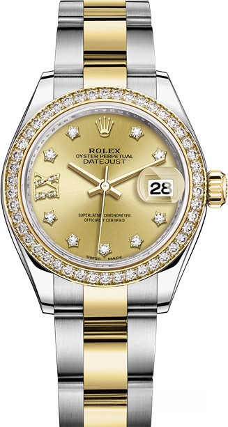 Часы Rolex Lady-Datejust изготовляются из нержавеющей стали и желтого золота 18к и отличаются новым циферблатом, который подчеркивает обновленный облик модели. Циферблат золотистый с белыми бриллиантами. Безель из белых бриллиантов. Модель Lady-Datejust оснащена калибром 2236 – механизмом нового поколения с функцией автоматического подзавода, который полностью разработан и изготовлен Ролексом. Данный механизм включает в себя кремниевую спираль Syloxi, запатентованную Ролексом, которая позволяет ему достигать хронометрической сверхточности, уникальной для женской модели часов. Этот механизм отмечен сертификатом Швейцарского хронометра, который выдан Официальным швейцарским институтом хронометрии (COSC). Часы комплектуются браслетом из нержавеющей стали и желтого золота 18к.
