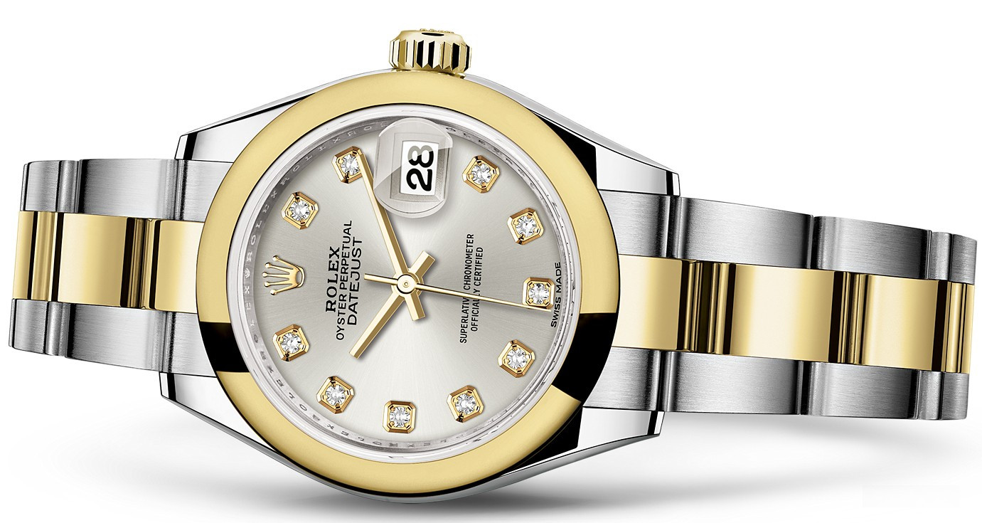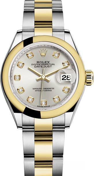 Часы Rolex Lady-Datejust изготовляются из нержавеющей стали и желтого золота 18к и отличаются новым циферблатом, который подчеркивает обновленный облик модели. Циферблат серебристый, 10 белых бриллиантов. Модель Lady-Datejust оснащена калибром 2236 – механизмом нового поколения с функцией автоматического подзавода, который полностью разработан и изготовлен Ролексом. Данный механизм включает в себя кремниевую спираль Syloxi, запатентованную Ролексом, которая позволяет ему достигать хронометрической сверхточности, уникальной для женской модели часов. Этот механизм отмечен сертификатом Швейцарского хронометра, который выдан Официальным швейцарским институтом хронометрии (COSC). Часы комплектуются браслетом из нержавеющей стали и желтого золота 18к.