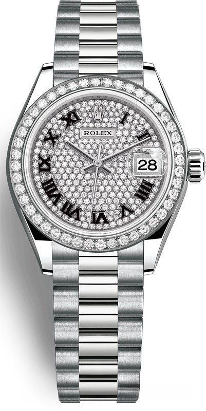 Часы Rolex Lady-Datejust изготовляются из белого золота 18к и отличаются новым циферблатом, который подчеркивает обновленный облик модели. Циферблат из белых бриллиантов. Модель Lady-Datejust оснащена калибром 2236 – механизмом нового поколения с функцией автоматического подзавода, который полностью разработан и изготовлен Ролексом. Данный механизм включает в себя кремниевую спираль Syloxi, запатентованную Ролексом, которая позволяет ему достигать хронометрической сверхточности, уникальной для женской модели часов. Этот механизм отмечен сертификатом Швейцарского хронометра, который выдан Официальным швейцарским институтом хронометрии (COSC). Часы комплектуются браслетом из белого золота 18к. Безель из белых бриллиантов.