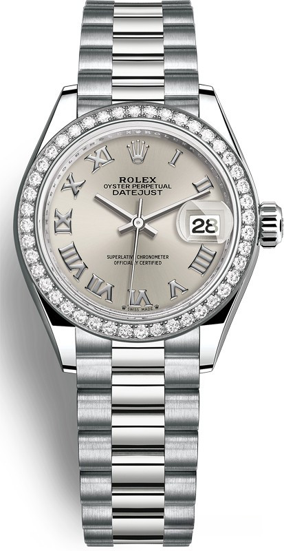 Часы Rolex Lady-Datejust изготовляются из белого золота 18к и отличаются новым циферблатом, который подчеркивает обновленный облик модели. Циферблат серебристый. Модель Lady-Datejust оснащена калибром 2236 – механизмом нового поколения с функцией автоматического подзавода, который полностью разработан и изготовлен Ролексом. Данный механизм включает в себя кремниевую спираль Syloxi, запатентованную Ролексом, которая позволяет ему достигать хронометрической сверхточности, уникальной для женской модели часов. Этот механизм отмечен сертификатом Швейцарского хронометра, который выдан Официальным швейцарским институтом хронометрии (COSC). Часы комплектуются браслетом из белого золота 18к. Безель из белых бриллиантов.