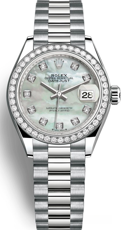 Часы Rolex Lady-Datejust изготовляются из белого золота 18к и отличаются новым циферблатом, который подчеркивает обновленный облик модели. Циферблат белый жемчужный с 10-ю белыми бриллиантами. Модель Lady-Datejust оснащена калибром 2236 – механизмом нового поколения с функцией автоматического подзавода, который полностью разработан и изготовлен Ролексом. Данный механизм включает в себя кремниевую спираль Syloxi, запатентованную Ролексом, которая позволяет ему достигать хронометрической сверхточности, уникальной для женской модели часов. Этот механизм отмечен сертификатом Швейцарского хронометра, который выдан Официальным швейцарским институтом хронометрии (COSC). Часы комплектуются браслетом из белого золота 18к. Безель из белых бриллиантов.