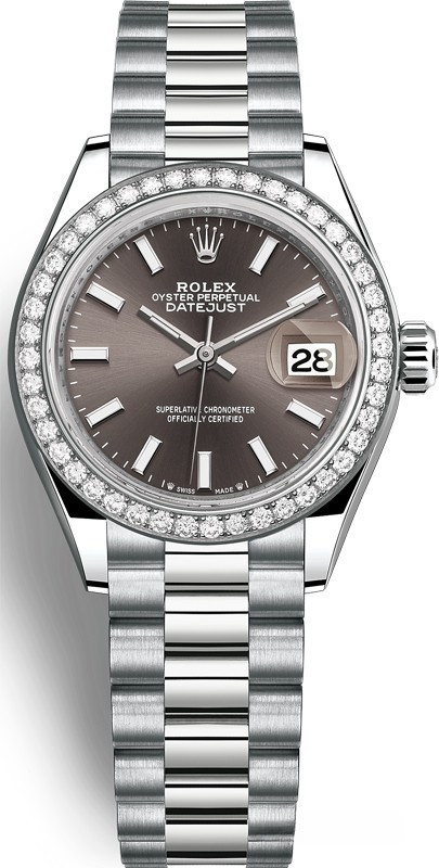 Часы Rolex Lady-Datejust изготовляются из белого золота 18к и отличаются новым циферблатом, который подчеркивает обновленный облик модели. Циферблат серый. Модель Lady-Datejust оснащена калибром 2236 – механизмом нового поколения с функцией автоматического подзавода, который полностью разработан и изготовлен Ролексом. Данный механизм включает в себя кремниевую спираль Syloxi, запатентованную Ролексом, которая позволяет ему достигать хронометрической сверхточности, уникальной для женской модели часов. Этот механизм отмечен сертификатом Швейцарского хронометра, который выдан Официальным швейцарским институтом хронометрии (COSC). Часы комплектуются браслетом из белого золота 18к. Безель из белых бриллиантов.