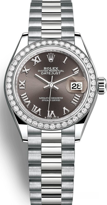 Часы Rolex Lady-Datejust изготовляются из белого золота 18к и отличаются новым циферблатом, который подчеркивает обновленный облик модели. Циферблат серый. Модель Lady-Datejust оснащена калибром 2236 – механизмом нового поколения с функцией автоматического подзавода, который полностью разработан и изготовлен Ролексом. Данный механизм включает в себя кремниевую спираль Syloxi, запатентованную Ролексом, которая позволяет ему достигать хронометрической сверхточности, уникальной для женской модели часов. Этот механизм отмечен сертификатом Швейцарского хронометра, который выдан Официальным швейцарским институтом хронометрии (COSC). Часы комплектуются браслетом из белого золота 18к. Безель из белых бриллиантов.
