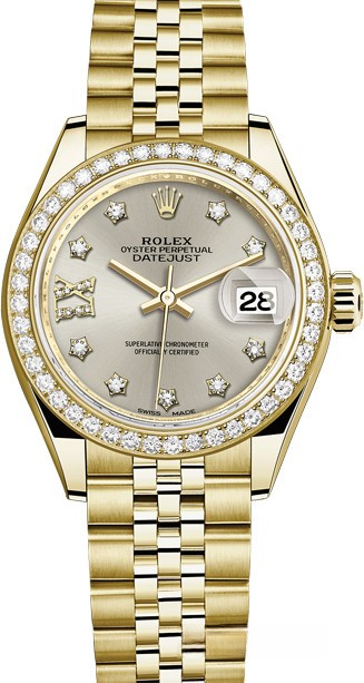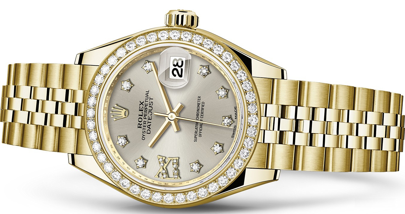 Часы Rolex Lady-Datejust изготовляются из желтого золота 18к и отличаются новым циферблатом, который подчеркивает обновленный облик модели. Серебристый циферблат с белыми бриллиантами отличается уникальной цветопередачей. Безель из белых бриллиантов. Новые накладки подчеркивают элегантность и женственность этой модели. Модель Lady-Datejust оснащена калибром 2236 – механизмом нового поколения с функцией автоматического подзавода, который полностью разработан и изготовлен Ролексом. Данный механизм включает в себя кремниевую спираль Syloxi, запатентованную Ролексом, которая позволяет ему достигать хронометрической сверхточности, уникальной для женской модели часов. Этот механизм отмечен сертификатом Швейцарского хронометра, который выдан Официальным швейцарским институтом хронометрии (COSC). Часы комплектуются браслетом из желтого золота 18к.