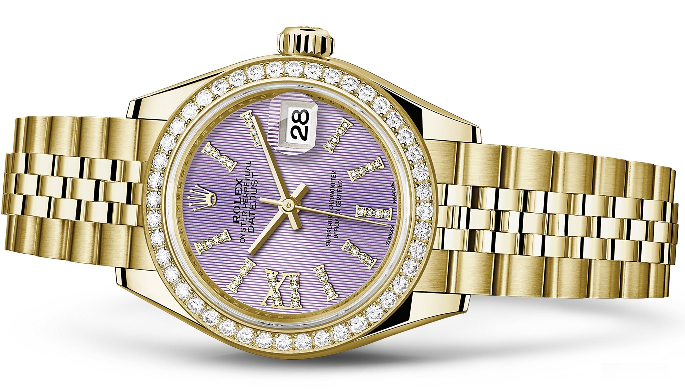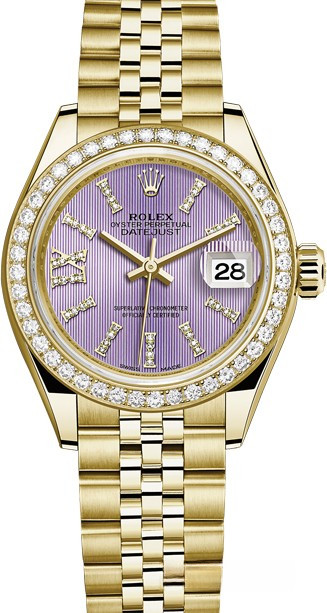 Часы Rolex Lady-Datejust изготовляются из желтого золота 18к и отличаются новым циферблатом, который подчеркивает обновленный облик модели. Фиолетовый гильошированный циферблат с белыми бриллиантами отличается уникальной цветопередачей. Безель из белых бриллиантов. Новые накладки подчеркивают элегантность и женственность этой модели. Модель Lady-Datejust оснащена калибром 2236 – механизмом нового поколения с функцией автоматического подзавода, который полностью разработан и изготовлен Ролексом. Данный механизм включает в себя кремниевую спираль Syloxi, запатентованную Ролексом, которая позволяет ему достигать хронометрической сверхточности, уникальной для женской модели часов. Этот механизм отмечен сертификатом Швейцарского хронометра, который выдан Официальным швейцарским институтом хронометрии (COSC). Часы комплектуются браслетом из желтого золота 18к.