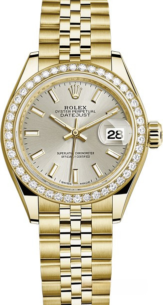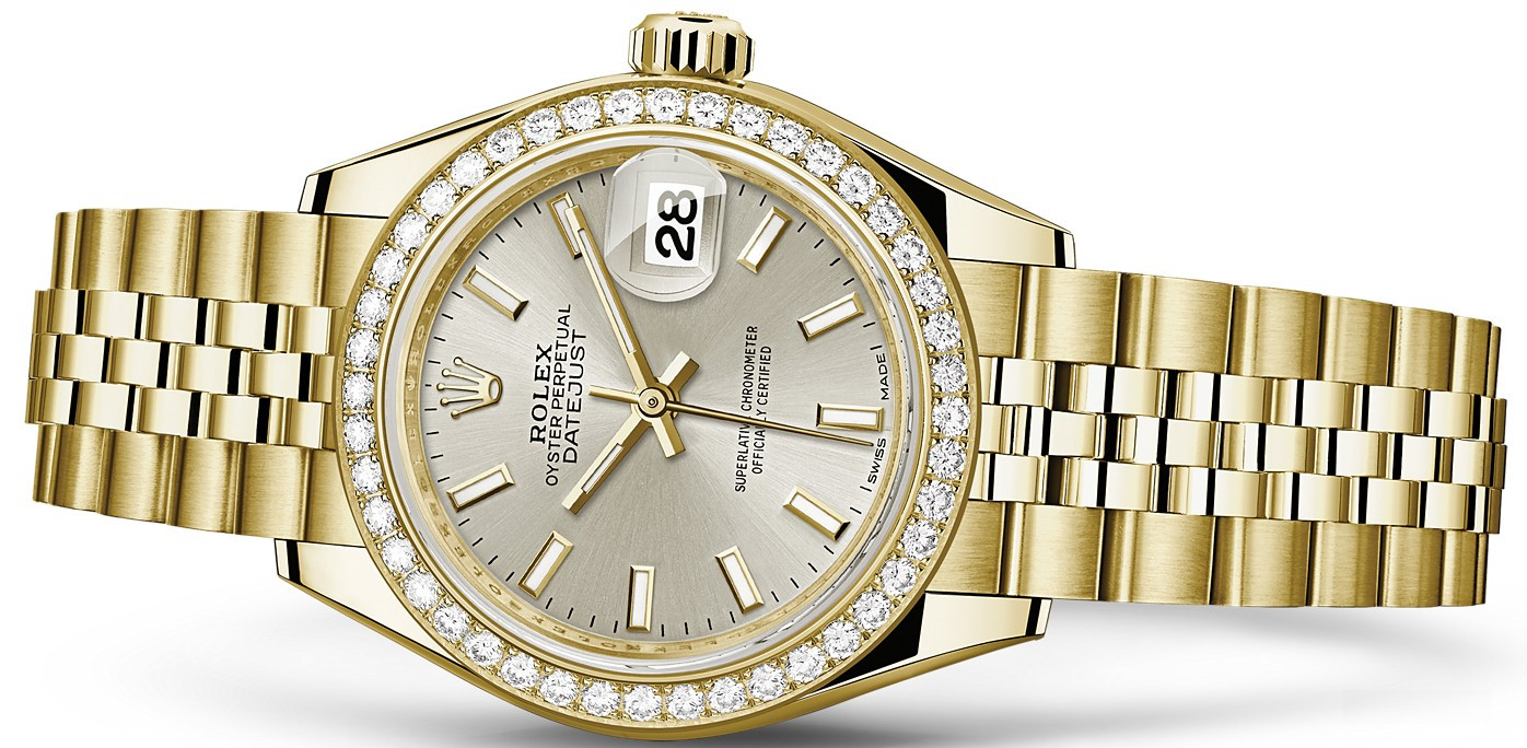 Часы Rolex Lady-Datejust изготовляются из желтого золота 18к и отличаются новым циферблатом, который подчеркивает обновленный облик модели. Циферблат серебристый, безель из белых бриллиантов. Новые накладки подчеркивают элегантность и женственность этой модели. Модель Lady-Datejust оснащена калибром 2236 – механизмом нового поколения с функцией автоматического подзавода, который полностью разработан и изготовлен Ролексом. Данный механизм включает в себя кремниевую спираль Syloxi, запатентованную Ролексом, которая позволяет ему достигать хронометрической сверхточности, уникальной для женской модели часов. Этот механизм отмечен сертификатом Швейцарского хронометра, который выдан Официальным швейцарским институтом хронометрии (COSC). Часы комплектуются браслетом из желтого золота 18к.