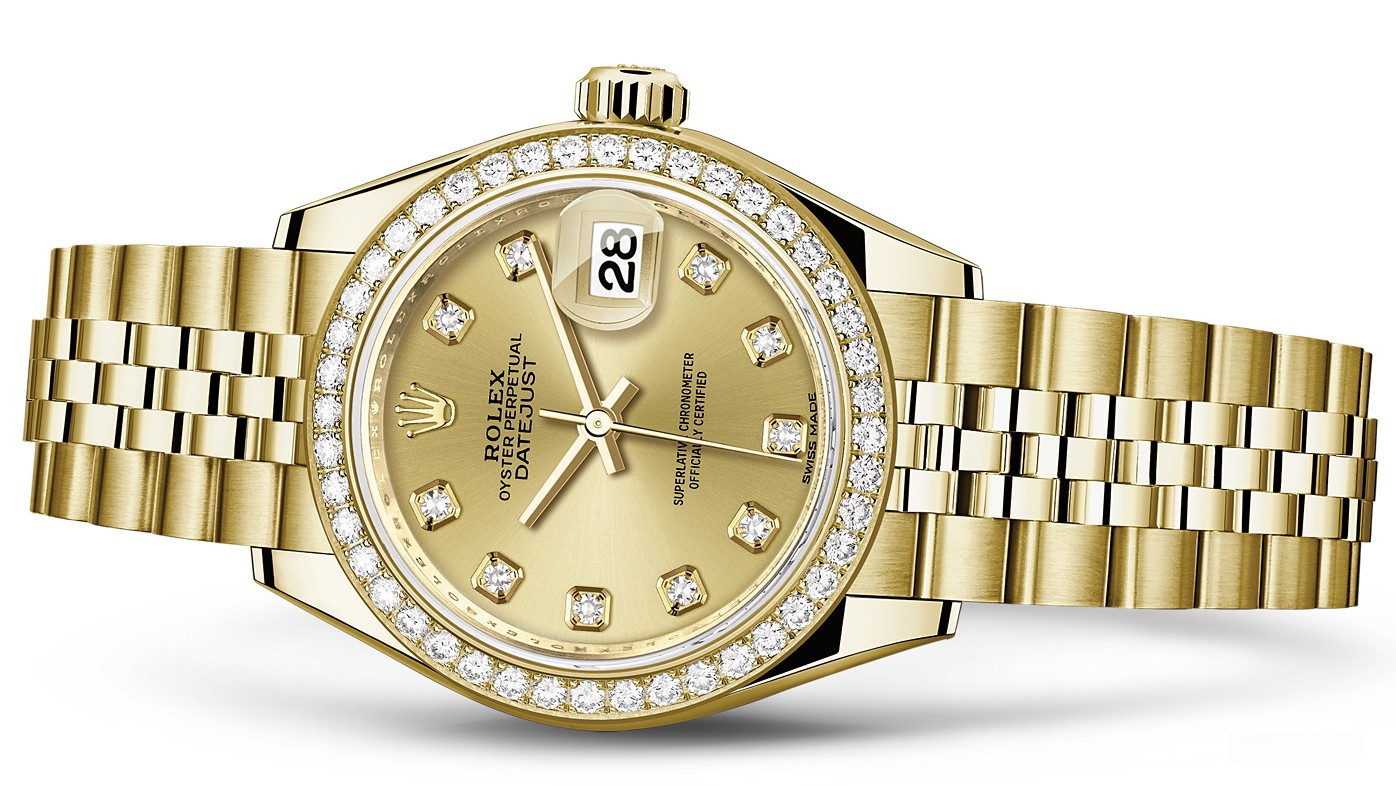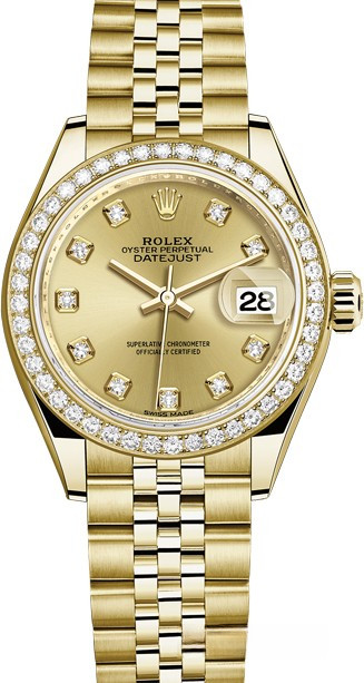 Часы Rolex Lady-Datejust изготовляются из желтого золота 18к и отличаются новым циферблатом, который подчеркивает обновленный облик модели. Циферблат золотистый, 10 белых бриллиантов. Безель из белых бриллиантов. Новые накладки подчеркивают элегантность и женственность этой модели. Модель Lady-Datejust оснащена калибром 2236 – механизмом нового поколения с функцией автоматического подзавода, который полностью разработан и изготовлен Ролексом. Данный механизм включает в себя кремниевую спираль Syloxi, запатентованную Ролексом, которая позволяет ему достигать хронометрической сверхточности, уникальной для женской модели часов. Этот механизм отмечен сертификатом Швейцарского хронометра, который выдан Официальным швейцарским институтом хронометрии (COSC). Часы комплектуются браслетом из желтого золота 18к.