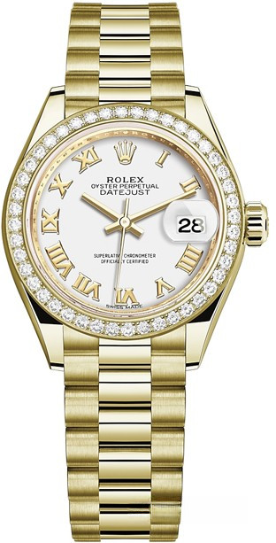 Часы Rolex Lady-Datejust изготовляются из желтого золота 18к и отличаются новым циферблатом, который подчеркивает обновленный облик модели. Циферблат белый. Модель Lady-Datejust оснащена калибром 2236 – механизмом нового поколения с функцией автоматического подзавода, который полностью разработан и изготовлен Ролексом. Данный механизм включает в себя кремниевую спираль Syloxi, запатентованную Ролексом, которая позволяет ему достигать хронометрической сверхточности, уникальной для женской модели часов. Этот механизм отмечен сертификатом Швейцарского хронометра, который выдан Официальным швейцарским институтом хронометрии (COSC). Часы комплектуются браслетом из желтого золота 18к. Безель из белых бриллиантов.