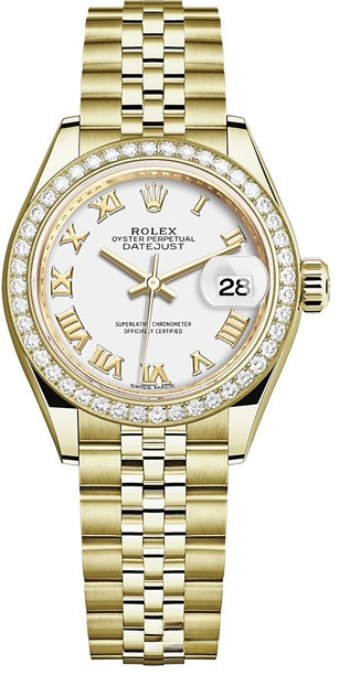 Часы Rolex Lady-Datejust изготовляются из желтого золота 18к и отличаются новым циферблатом, который подчеркивает обновленный облик модели. Циферблат белый. Модель Lady-Datejust оснащена калибром 2236 – механизмом нового поколения с функцией автоматического подзавода, который полностью разработан и изготовлен Ролексом. Данный механизм включает в себя кремниевую спираль Syloxi, запатентованную Ролексом, которая позволяет ему достигать хронометрической сверхточности, уникальной для женской модели часов. Этот механизм отмечен сертификатом Швейцарского хронометра, который выдан Официальным швейцарским институтом хронометрии (COSC). Часы комплектуются браслетом из желтого золота 18к. Безель из белых бриллиантов.