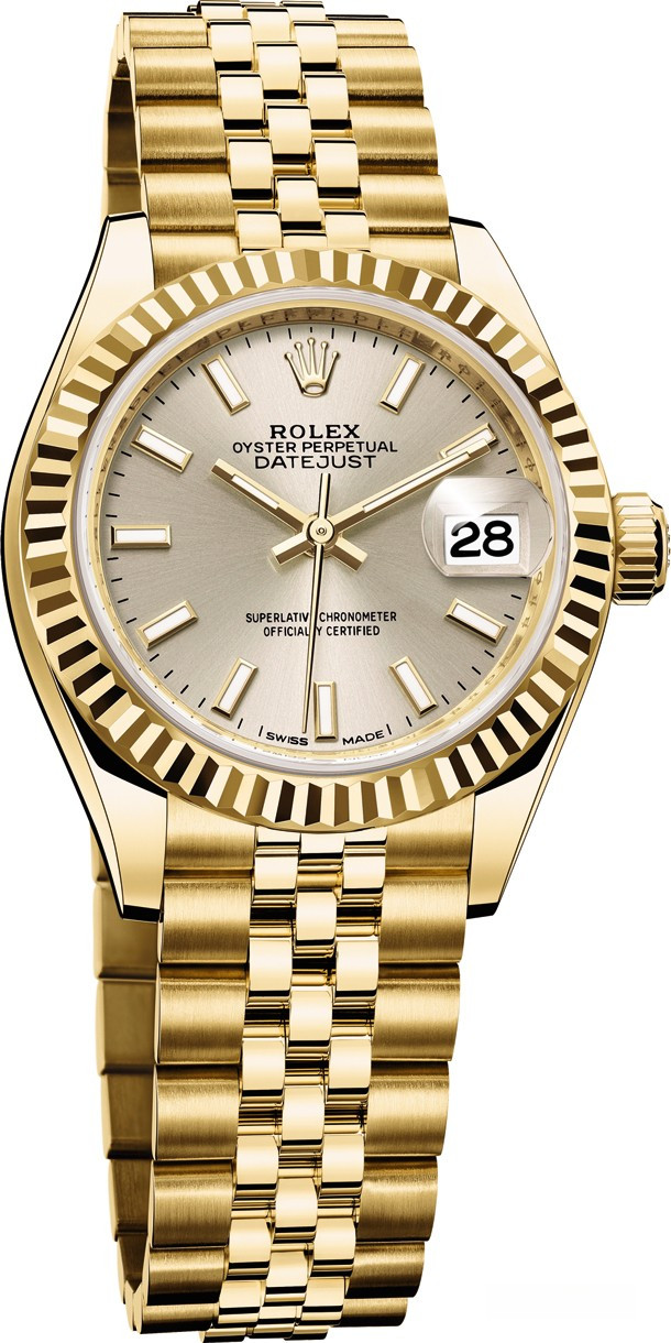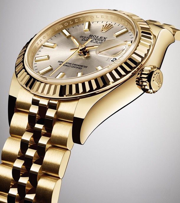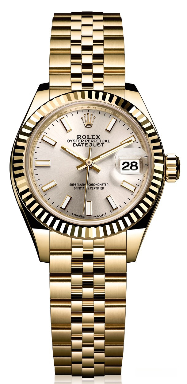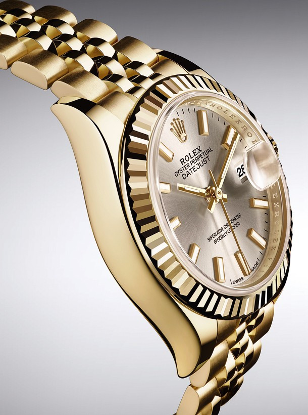 Новые часы Rolex Lady-Datejust изготовляются из желтого золота 18к и отличаются новым циферблатом, который подчеркивает обновленный облик модели. Благодаря применению технологии двойной отделки, в которой сочетается нанесение рисунка и отделка циферблата с солнечным переливом, циферблат отличается уникальной цветопередачей. Новые накладки подчеркивают элегантность и женственность этой модели. Модель Lady-Datejust оснащена калибром 2236 – механизмом нового поколения с функцией автоматического подзавода, который полностью разработан и изготовлен Ролексом. Данный механизм включает в себя кремниевую спираль Syloxi, запатентованную Ролексом, которая позволяет ему достигать хронометрической сверхточности, уникальной для женской модели часов. Этот механизм отмечен сертификатом Швейцарского хронометра, который выдан Официальным швейцарским институтом хронометрии (COSC). Часы комплектуются браслетом из желтого золота 18к.