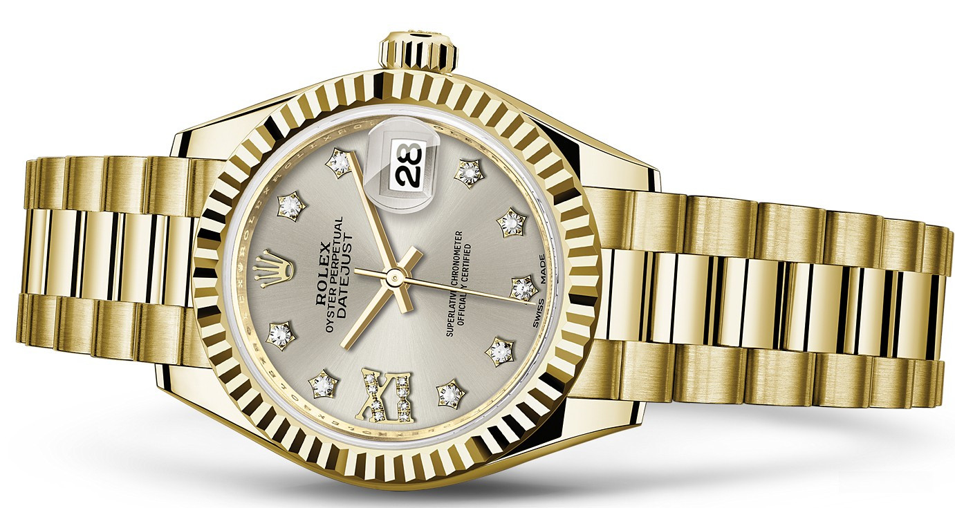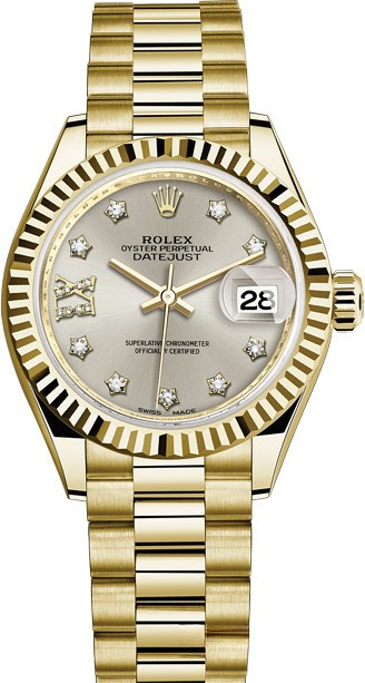 Часы Rolex Lady-Datejust изготовляются из желтого золота 18к и отличаются новым циферблатом, который подчеркивает обновленный облик модели. Серебристый циферблат с белыми бриллиантами отличается уникальной цветопередачей. Новые накладки подчеркивают элегантность и женственность этой модели. Модель Lady-Datejust оснащена калибром 2236 – механизмом нового поколения с функцией автоматического подзавода, который полностью разработан и изготовлен Ролексом. Данный механизм включает в себя кремниевую спираль Syloxi, запатентованную Ролексом, которая позволяет ему достигать хронометрической сверхточности, уникальной для женской модели часов. Этот механизм отмечен сертификатом Швейцарского хронометра, который выдан Официальным швейцарским институтом хронометрии (COSC). Часы комплектуются браслетом из желтого золота 18к.