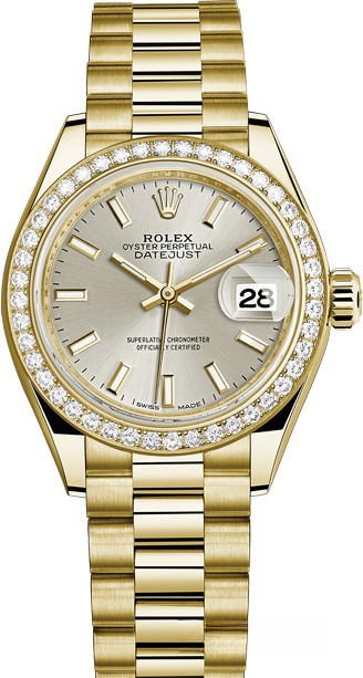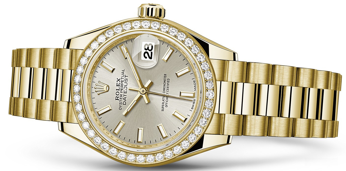 Часы Rolex Lady-Datejust изготовляются из желтого золота 18к и отличаются новым циферблатом, который подчеркивает обновленный облик модели. Серебристый циферблат отличается уникальной цветопередачей. Безель из белых бриллиантов. Новые накладки подчеркивают элегантность и женственность этой модели. Модель Lady-Datejust оснащена калибром 2236 – механизмом нового поколения с функцией автоматического подзавода, который полностью разработан и изготовлен Ролексом. Данный механизм включает в себя кремниевую спираль Syloxi, запатентованную Ролексом, которая позволяет ему достигать хронометрической сверхточности, уникальной для женской модели часов. Этот механизм отмечен сертификатом Швейцарского хронометра, который выдан Официальным швейцарским институтом хронометрии (COSC). Часы комплектуются браслетом из желтого золота 18к.