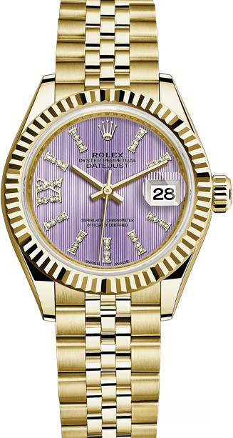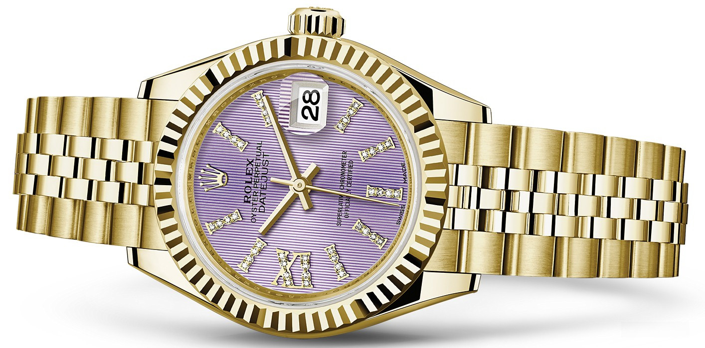 Часы Rolex Lady-Datejust изготовляются из желтого золота 18к и отличаются новым циферблатом, который подчеркивает обновленный облик модели. Циферблат фиолетовый гильошированный, белые бриллианты. Новые накладки подчеркивают элегантность и женственность этой модели. Модель Lady-Datejust оснащена калибром 2236 – механизмом нового поколения с функцией автоматического подзавода, который полностью разработан и изготовлен Ролексом. Данный механизм включает в себя кремниевую спираль Syloxi, запатентованную Ролексом, которая позволяет ему достигать хронометрической сверхточности, уникальной для женской модели часов. Этот механизм отмечен сертификатом Швейцарского хронометра, который выдан Официальным швейцарским институтом хронометрии (COSC). Часы комплектуются браслетом из желтого золота 18к.