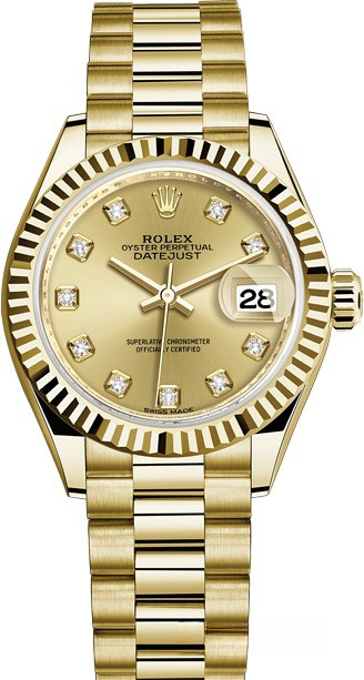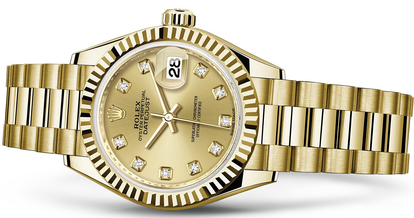 Часы Rolex Lady-Datejust изготовляются из желтого золота 18к и отличаются новым циферблатом, который подчеркивает обновленный облик модели. Циферблат золотистый, 10 белых бриллиантов. Новые накладки подчеркивают элегантность и женственность этой модели. Модель Lady-Datejust оснащена калибром 2236 – механизмом нового поколения с функцией автоматического подзавода, который полностью разработан и изготовлен Ролексом. Данный механизм включает в себя кремниевую спираль Syloxi, запатентованную Ролексом, которая позволяет ему достигать хронометрической сверхточности, уникальной для женской модели часов. Этот механизм отмечен сертификатом Швейцарского хронометра, который выдан Официальным швейцарским институтом хронометрии (COSC). Часы комплектуются браслетом из желтого золота 18к.