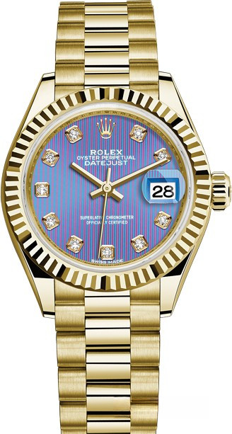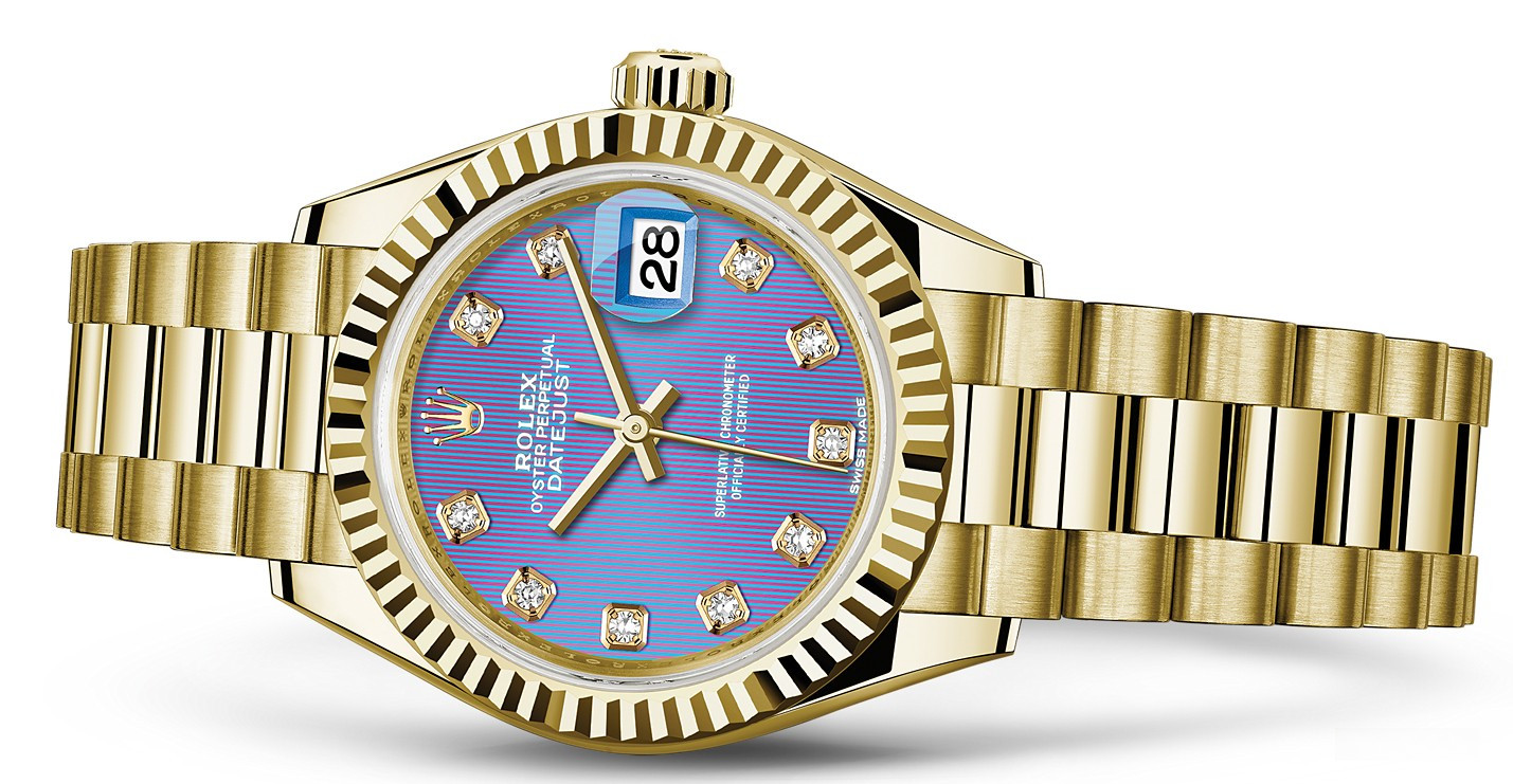 Часы Rolex Lady-Datejust изготовляются из желтого золота 18к и отличаются новым циферблатом, который подчеркивает обновленный облик модели. Циферблат синий гильошированный, 10 белых бриллиантов. Новые накладки подчеркивают элегантность и женственность этой модели. Модель Lady-Datejust оснащена калибром 2236 – механизмом нового поколения с функцией автоматического подзавода, который полностью разработан и изготовлен Ролексом. Данный механизм включает в себя кремниевую спираль Syloxi, запатентованную Ролексом, которая позволяет ему достигать хронометрической сверхточности, уникальной для женской модели часов. Этот механизм отмечен сертификатом Швейцарского хронометра, который выдан Официальным швейцарским институтом хронометрии (COSC). Часы комплектуются браслетом из желтого золота 18к.