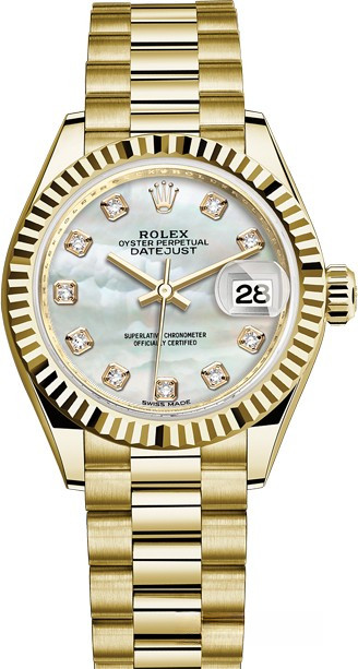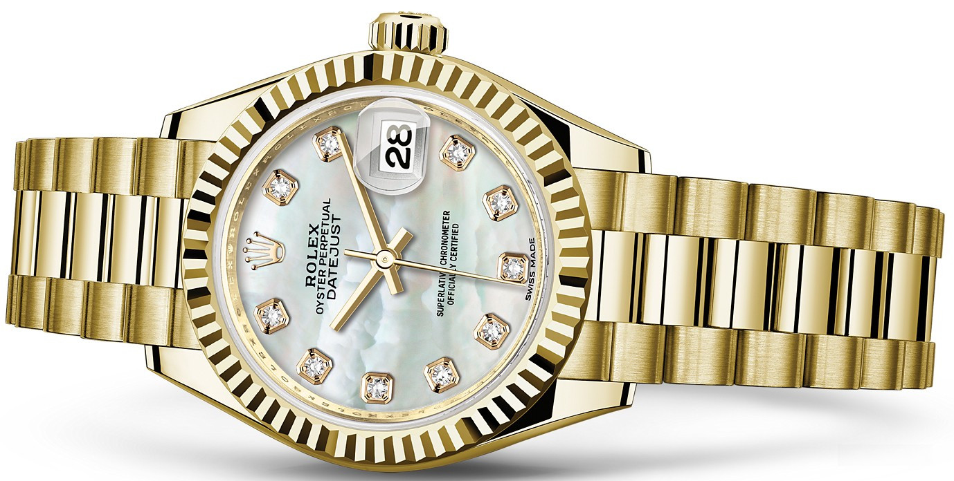 Часы Rolex Lady-Datejust изготовляются из желтого золота 18к и отличаются новым циферблатом, который подчеркивает обновленный облик модели. Циферблат белый жемчужный, 10 белых бриллиантов. Новые накладки подчеркивают элегантность и женственность этой модели. Модель Lady-Datejust оснащена калибром 2236 – механизмом нового поколения с функцией автоматического подзавода, который полностью разработан и изготовлен Ролексом. Данный механизм включает в себя кремниевую спираль Syloxi, запатентованную Ролексом, которая позволяет ему достигать хронометрической сверхточности, уникальной для женской модели часов. Этот механизм отмечен сертификатом Швейцарского хронометра, который выдан Официальным швейцарским институтом хронометрии (COSC). Часы комплектуются браслетом из желтого золота 18к.
