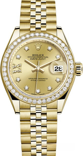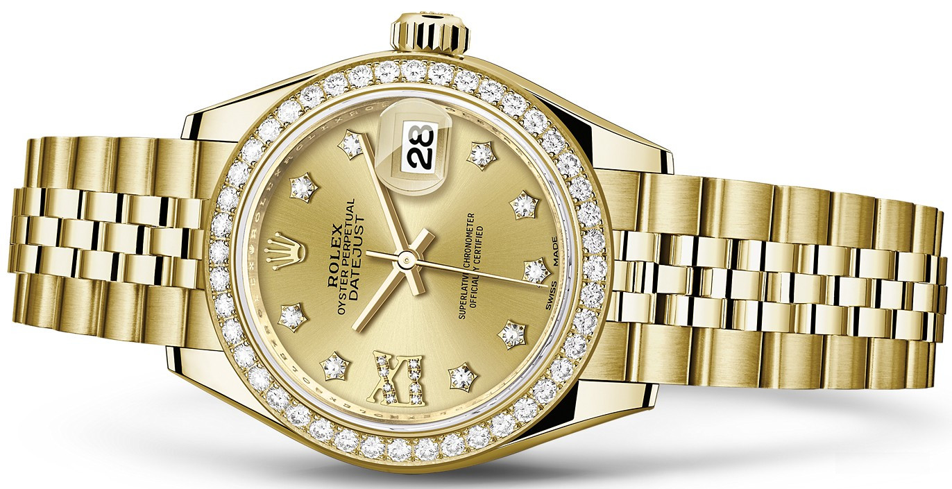Часы Rolex Lady-Datejust изготовляются из желтого золота 18к и отличаются новым циферблатом, который подчеркивает обновленный облик модели. Циферблат золотистый, белые бриллианты, безель из белых бриллиантов. Новые накладки подчеркивают элегантность и женственность этой модели. Модель Lady-Datejust оснащена калибром 2236 – механизмом нового поколения с функцией автоматического подзавода, который полностью разработан и изготовлен Ролексом. Данный механизм включает в себя кремниевую спираль Syloxi, запатентованную Ролексом, которая позволяет ему достигать хронометрической сверхточности, уникальной для женской модели часов. Этот механизм отмечен сертификатом Швейцарского хронометра, который выдан Официальным швейцарским институтом хронометрии (COSC). Часы комплектуются браслетом из желтого золота 18к.