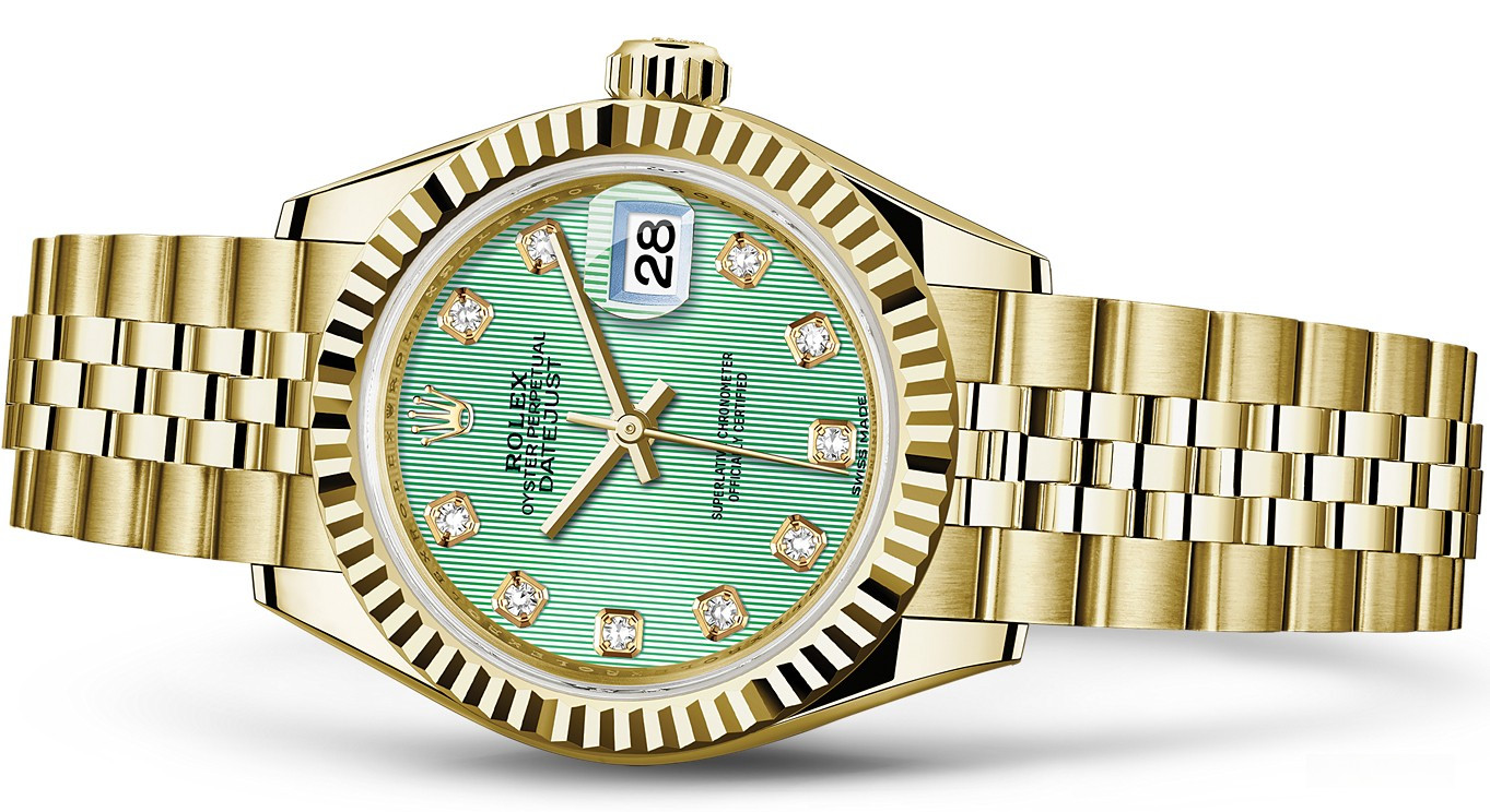 Часы Rolex Lady-Datejust изготовляются из желтого золота 18к и отличаются новым циферблатом, который подчеркивает обновленный облик модели. Зеленый циферблат с 10-ю белыми бриллиантами отличается уникальной цветопередачей. Новые накладки подчеркивают элегантность и женственность этой модели. Модель Lady-Datejust оснащена калибром 2236 – механизмом нового поколения с функцией автоматического подзавода, который полностью разработан и изготовлен Ролексом. Данный механизм включает в себя кремниевую спираль Syloxi, запатентованную Ролексом, которая позволяет ему достигать хронометрической сверхточности, уникальной для женской модели часов. Этот механизм отмечен сертификатом Швейцарского хронометра, который выдан Официальным швейцарским институтом хронометрии (COSC). Часы комплектуются браслетом из желтого золота 18к.