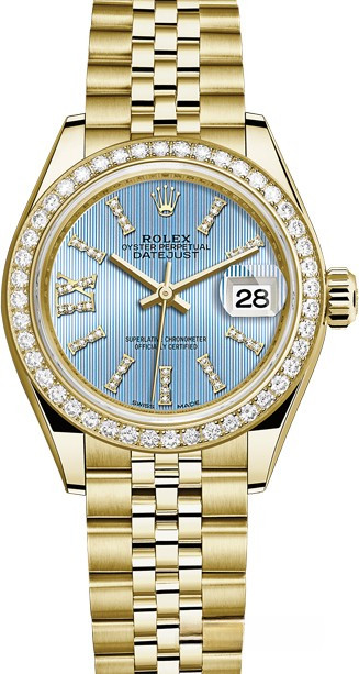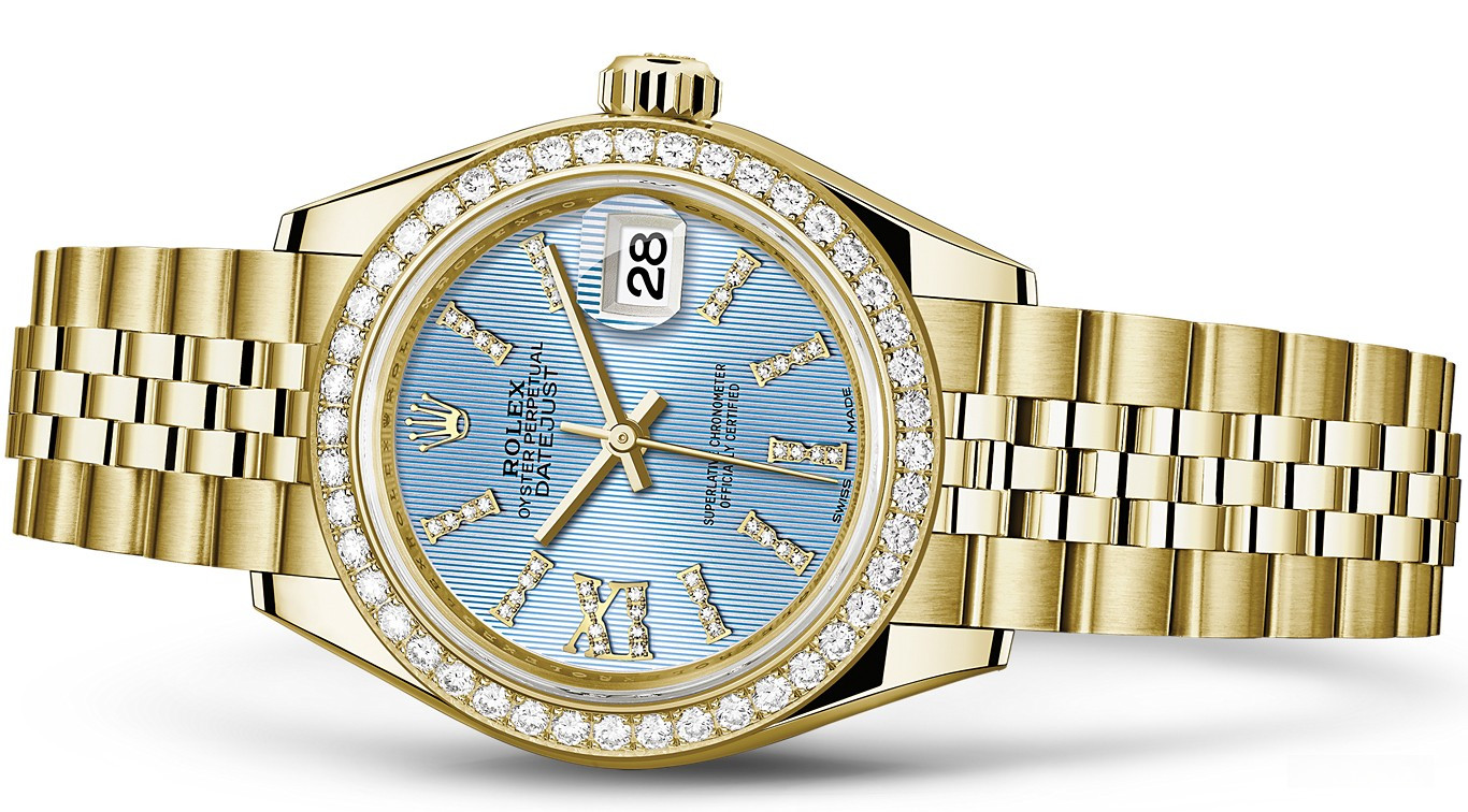 Часы Rolex Lady-Datejust изготовляются из желтого золота 18к и отличаются новым циферблатом, который подчеркивает обновленный облик модели. Циферблат голубой гильошированный, белые бриллианты, безель из белых бриллиантов. Новые накладки подчеркивают элегантность и женственность этой модели. Модель Lady-Datejust оснащена калибром 2236 – механизмом нового поколения с функцией автоматического подзавода, который полностью разработан и изготовлен Ролексом. Данный механизм включает в себя кремниевую спираль Syloxi, запатентованную Ролексом, которая позволяет ему достигать хронометрической сверхточности, уникальной для женской модели часов. Этот механизм отмечен сертификатом Швейцарского хронометра, который выдан Официальным швейцарским институтом хронометрии (COSC). Часы комплектуются браслетом из желтого золота 18к.