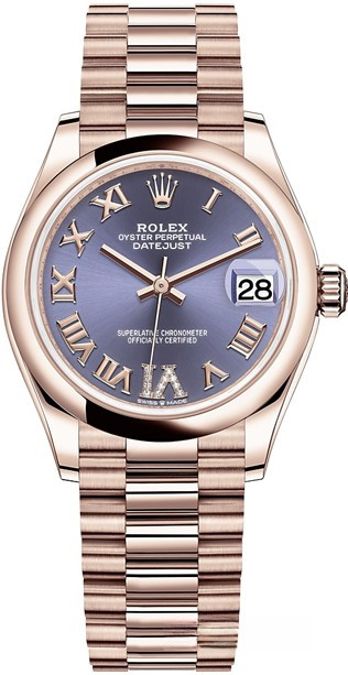 Часы Rolex Datejust Datejust 31mm Everose Gold выпущены в круглом корпусе из розового золота 18к. Размер составляет 31 мм, водонепроницаемость 100 м. Внутри корпуса установлен автоматический механизм, Калибр 2236 с запасом хода 55 часов. На синем циферблате с белыми бриллиантами отображаются часы, минуты, секунды, дата. Часы комплектуются браслетом из розового золота 18к.