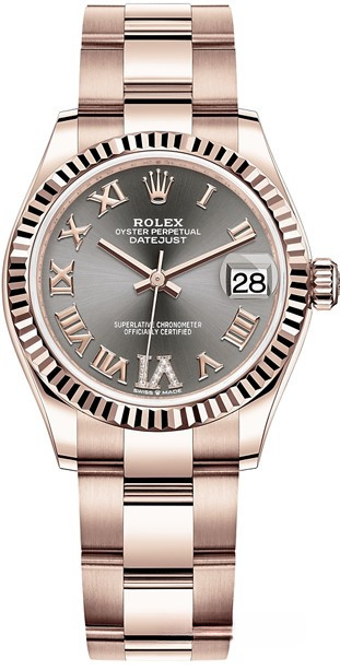 Часы Rolex Datejust Datejust 31mm Everose Gold выпущены в круглом корпусе из розового золота 18к. Размер составляет 31 мм, водонепроницаемость 100 м. Внутри корпуса установлен автоматический механизм, Калибр 2236 с запасом хода 55 часов. На сером циферблате с белыми бриллиантами отображаются часы, минуты, секунды, дата. Часы комплектуются браслетом из розового золота 18к.