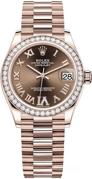 Часы Rolex Datejust Datejust 31mm Everose Gold выпущены в круглом корпусе из розового золота 18к. Размер составляет 31 мм, водонепроницаемость 100 м. Внутри корпуса установлен автоматический механизм, Калибр 2236 с запасом хода 55 часов. На коричневом циферблате с белыми бриллиантами отображаются часы, минуты, секунды, дата. Часы комплектуются браслетом из розового золота 18к. Безель из белых бриллиантов.