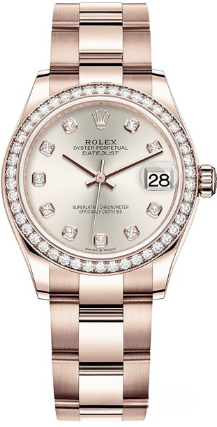 Часы Rolex Datejust Datejust 31mm Everose Gold выпущены в круглом корпусе из розового золота 18к. Размер составляет 31 мм, водонепроницаемость 100 м. Внутри корпуса установлен автоматический механизм, Калибр 2236 с запасом хода 55 часов. На серебристом с 10-ю белыми бриллиантами циферблате отображаются часы, минуты, секунды, дата. Часы комплектуются браслетом из розового золота 18к. Безель из белых бриллиантов.