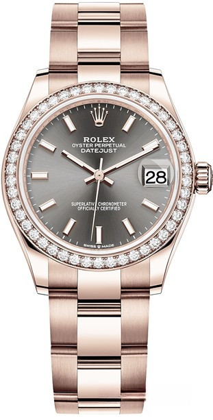 Часы Rolex Datejust Datejust 31mm Everose Gold выпущены в круглом корпусе из розового золота 18к. Размер составляет 31 мм, водонепроницаемость 100 м. Внутри корпуса установлен автоматический механизм, Калибр 2236 с запасом хода 55 часов. На сером циферблате отображаются часы, минуты, секунды, дата. Часы комплектуются браслетом из розового золота 18к. Безель из белых бриллиантов.