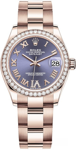 Часы Rolex Datejust Datejust 31mm Everose Gold выпущены в круглом корпусе из розового золота 18к. Размер составляет 31 мм, водонепроницаемость 100 м. Внутри корпуса установлен автоматический механизм, Калибр 2236 с запасом хода 55 часов. На синем с белыми бриллиантами циферблате отображаются часы, минуты, секунды, дата. Часы комплектуются браслетом из розового золота 18к. Безель из белых бриллиантов.