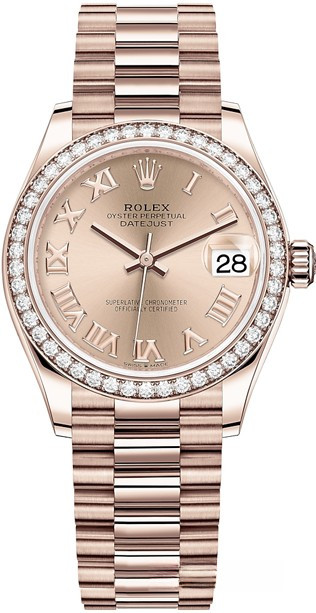 Часы Rolex Datejust Datejust 31mm Everose Gold выпущены в круглом корпусе из розового золота 18к. Размер составляет 31 мм, водонепроницаемость 100 м. Внутри корпуса установлен автоматический механизм, Калибр 2236 с запасом хода 55 часов. На золотистом циферблате отображаются часы, минуты, секунды, дата. Часы комплектуются браслетом из розового золота 18к. Безель из белых бриллиантов.