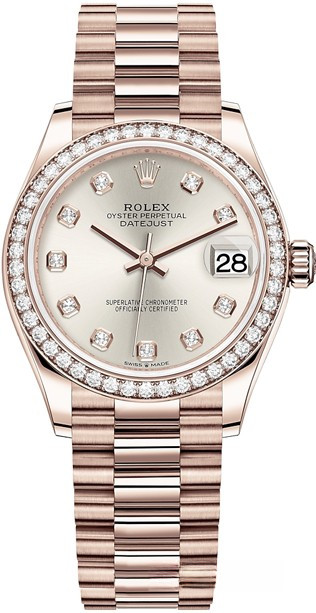 Часы Rolex Datejust Datejust 31mm Everose Gold выпущены в круглом корпусе из розового золота 18к. Размер составляет 31 мм, водонепроницаемость 100 м. Внутри корпуса установлен автоматический механизм, Калибр 2236 с запасом хода 55 часов. На серебристом циферблате с 10-ю белыми бриллиантами отображаются часы, минуты, секунды, дата. Часы комплектуются браслетом из розового золота 18к. Безель из белых бриллиантов.